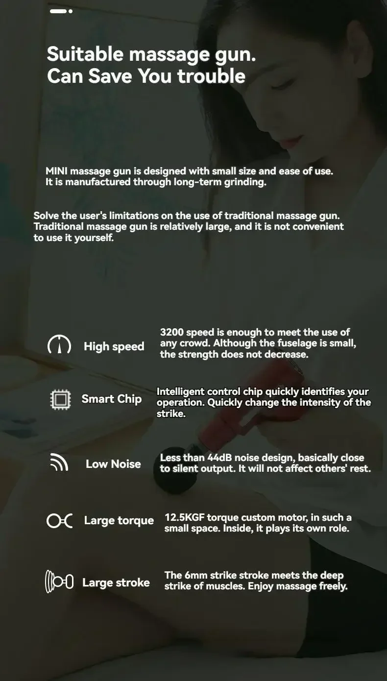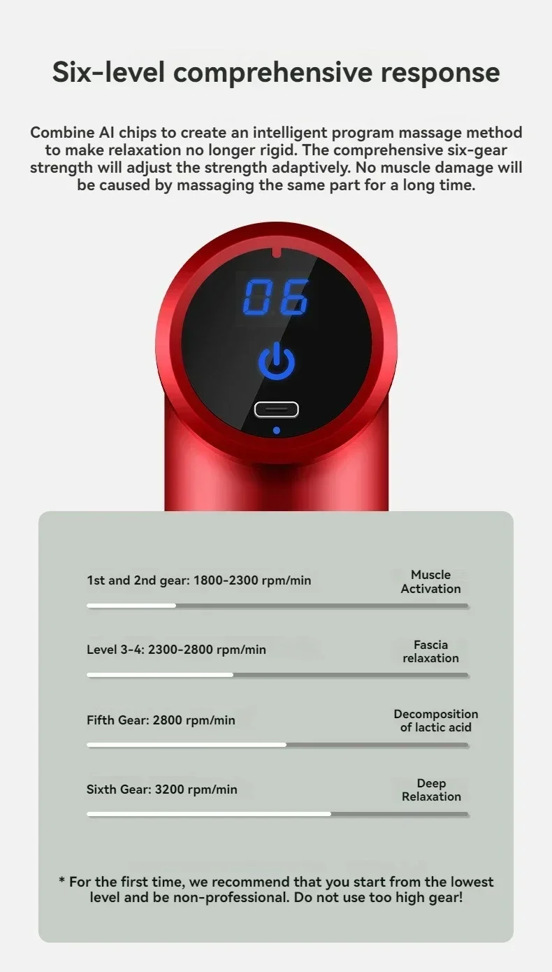 Experience ultimate relaxation with our Portable Mini Massage Gun, designed for on-the-go muscle relief and relaxation. Why you'll love it: - Compact and lightweight for easy portability. - High-speed performance up to 3200 RPM for effective muscle targeting. - Whisper-quiet operation under 44dB for discreet use. - Equipped with 4 massage heads for versatile treatment options. - Smart chip technology for responsive pressure adjustment. This premium device is made from durable ABS material and features an array of colors, including black, grey, green, and red. It is designed to meet the muscle relaxation needs of everyone, making it the best seller in fitness equipment. Simply choose your desired massage head, turn on the device, and glide over any sore muscles for immediate relief. The lightweight nature ensures you can take it anywhere—perfect for home, gym, or travel. Don’t miss out on this exclusive offer, grab yours today!
